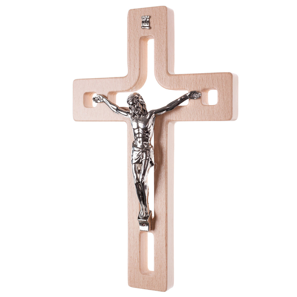 Hölzernes hängendes Kreuz modern mit dem Passionskreuz natürlich 18x12x1,4 cm