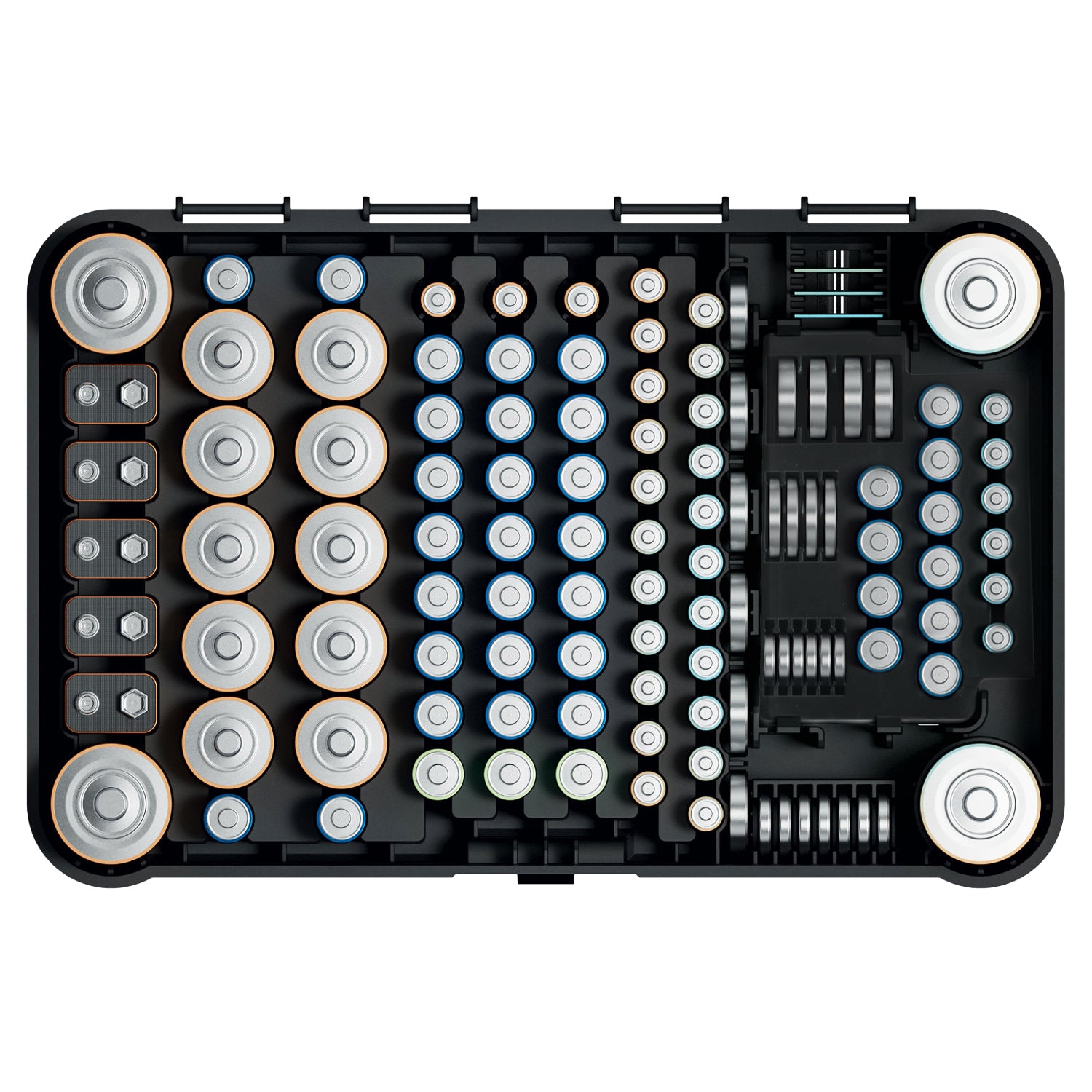 - Bis zu 115 Aufbewahrungsplätze für verschiedene Batterietypen
