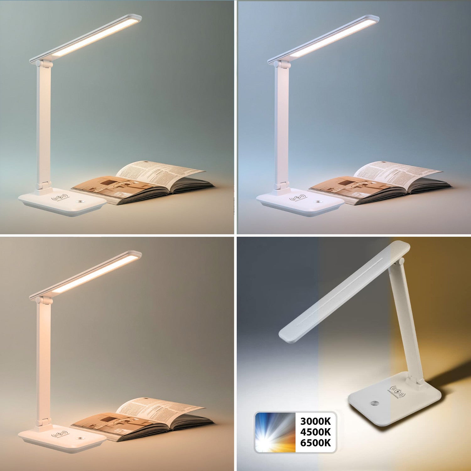Diese MCE616 W LED Schreibtischlampe von Maclean vereint ein modernes Design und eine 450 max Lumen Leuchtkraft. Die MCE616 W wird auch Ihren Alltag erleichtern und Ihnen dabei helfen, das Maximum aus jedem Tag uszuholen. Die Kombination aus 3 Farbtemperaturen, der Mehrwinkel-Anpassung und eingebauter stufenloser Dimmer ermöglicht eine optimale Ausleuchtung Ihres Arbeitsplatzes unter Berücksichtigung Ihrer individuellen Vorlieben. Die Lampe ist leicht einzustellen, schlank und kann frei in verschiedene Winkel (Rotierender Kopf - 180 Grad, verstellbarer Arm - 90 Grad) gebogen werden, die können so den besten Beleuchtungswinkel auswählen, um verschiedenen Anforderungen gerecht zu werden. Das Produkt kann die Farbtemperatur des Lichts ändern (3000K - warmweiß, 4500K - neutralweiß, 6500K - kaltweiß). Der Standfuß der Lampe dient nicht nur zur Stabilisierung. Er hat außerdem eine drahtlose Ladefunktion für Smartphones eingebaut. Legen Sie Ihr iPhone, Samsung Handy oder ähnliches einfach auf die Fläche und schon kann das Aufladen per Induktion beginnen. Hierzu muss Ihr Smartphone mit der kabellosen Ladefunktion ausgestattet sein.