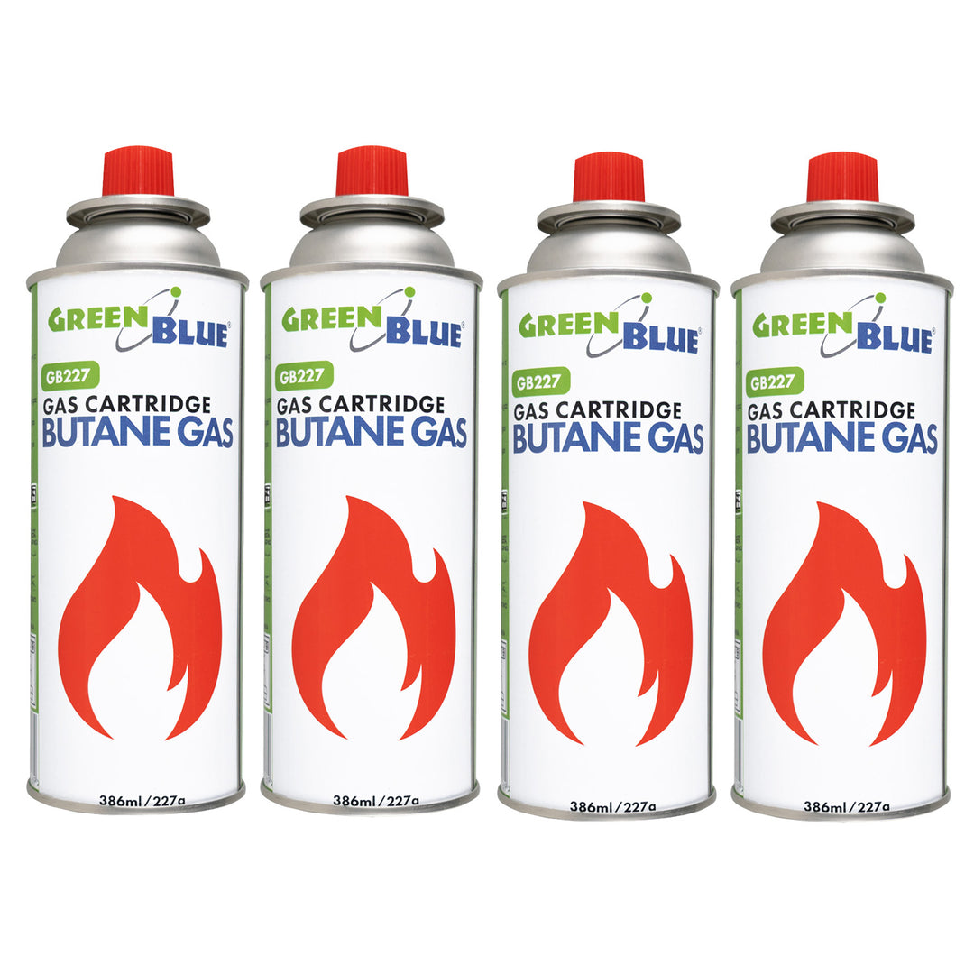 4 Gaspatronen à 227 g GreenBlue. Zertifikat: Pi 0875, entspricht der Norm EN 417, Butan, Einsatzbereich -10 °C bis +40 °C, GB227