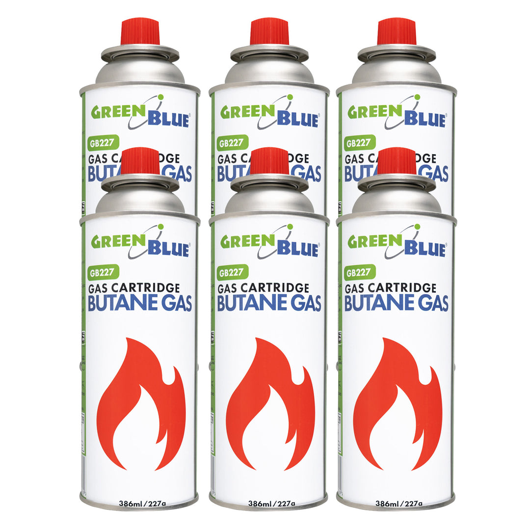 6 Gaspatronen à 227 g GreenBlue. Zertifikat: Pi 0875, entspricht der Norm EN 417, Butan, Einsatzbereich -10 °C bis +40 °C, GB227