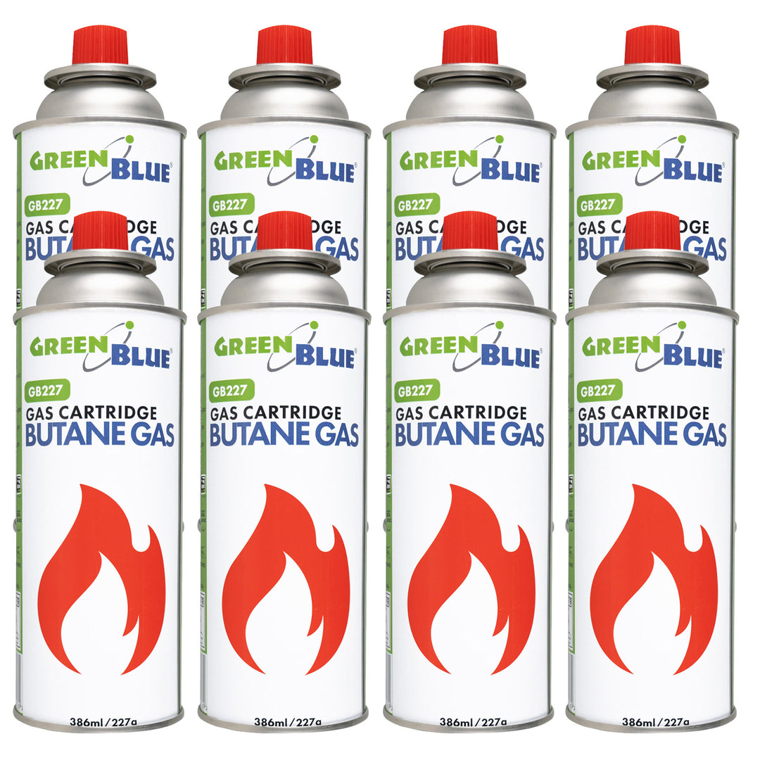 8 Gaspatronen à 227 g GreenBlue. Zertifikat: Pi 0875, entspricht der Norm EN 417, Butan, Einsatzbereich -10 °C bis +40 °C, GB227