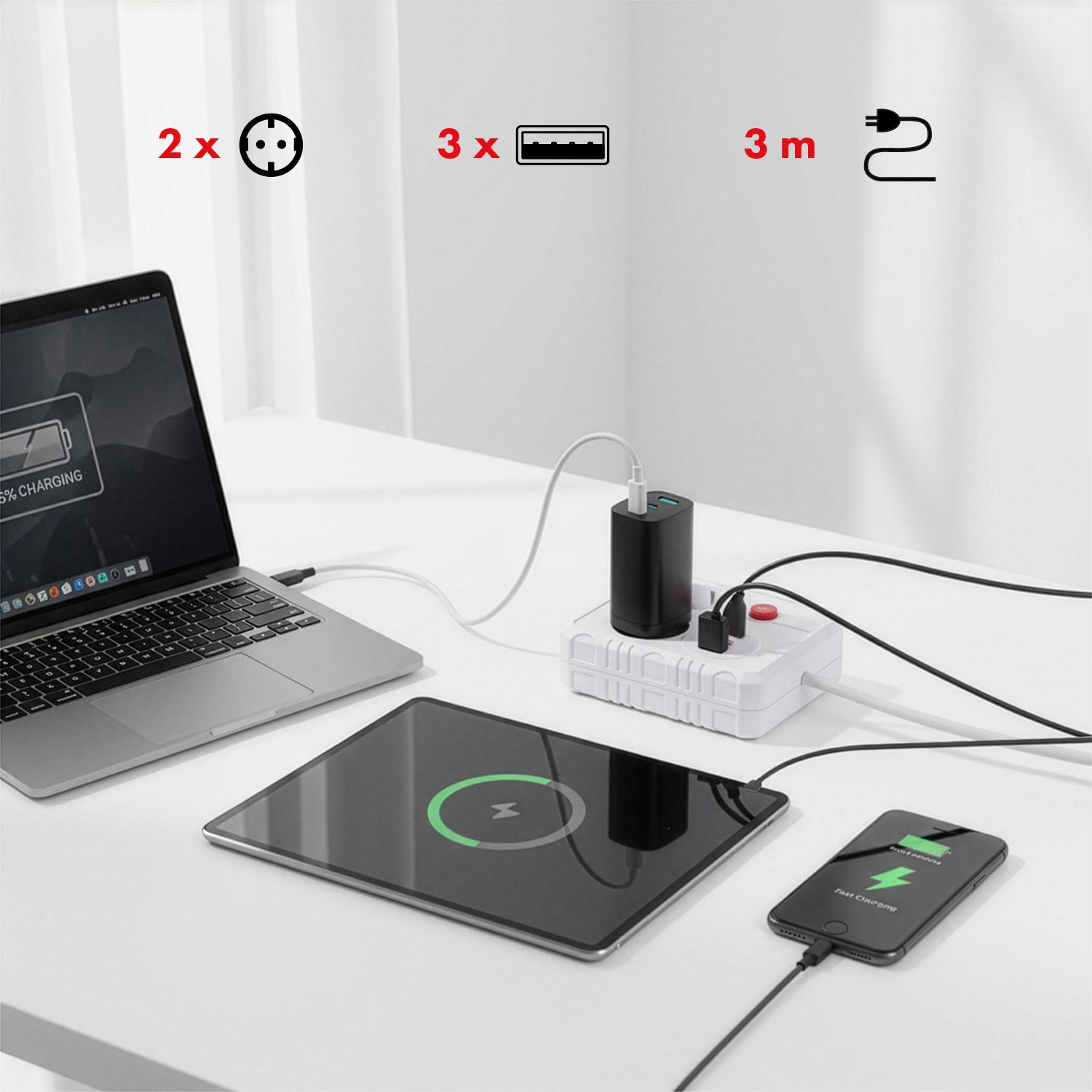 2 Netzsteckdosen und 3 USB-Anschlüsse - Energie immer zur Hand