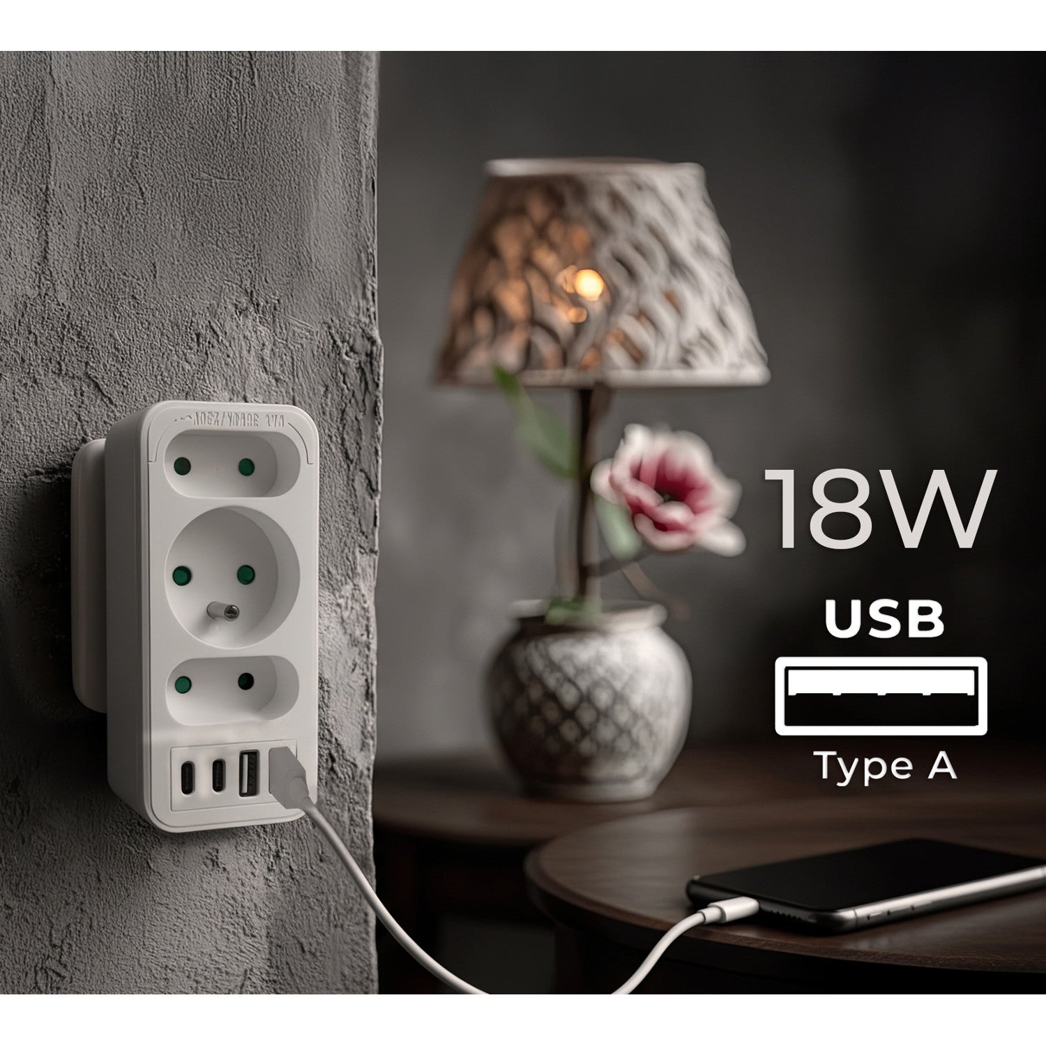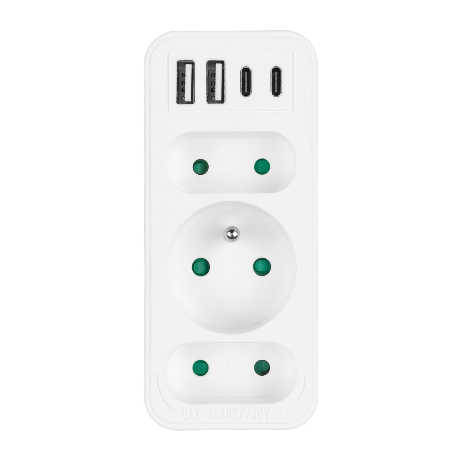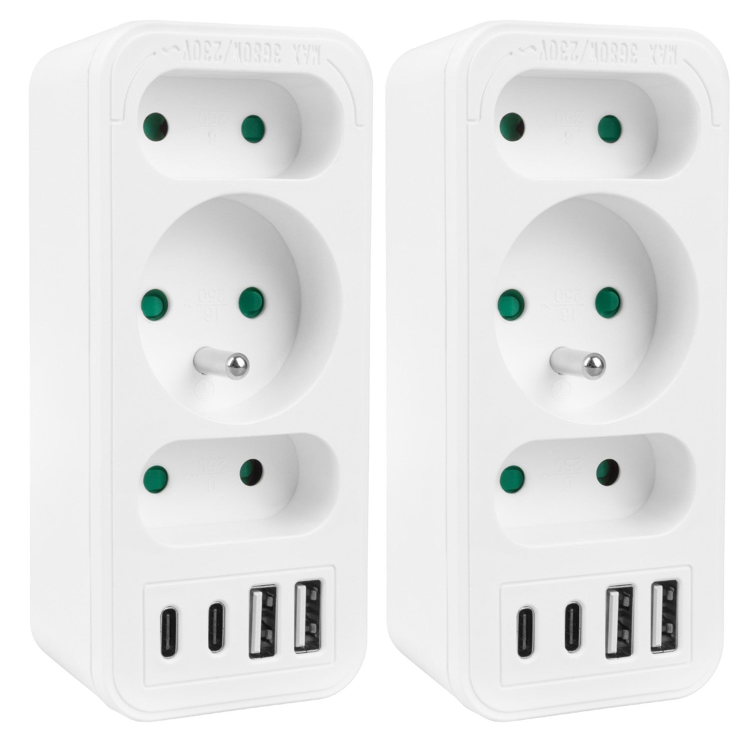 2x Splitter 3 Buchsen 2x USB-A 2x USB-C weiß