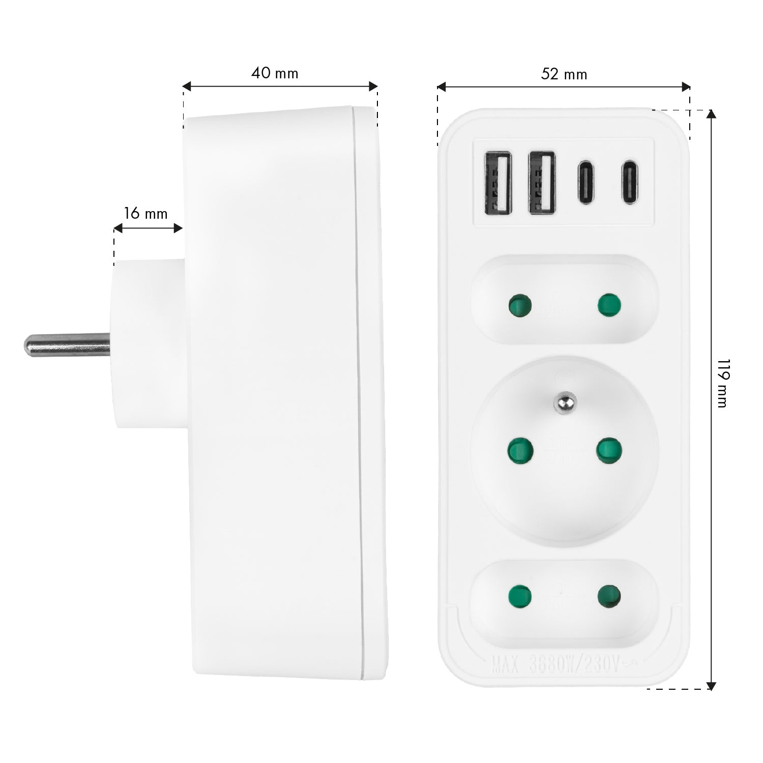 - Splitter mit 3 Buchsen, 2xUSB A, 2xUSB C MCE248 F/W - 2 Stück