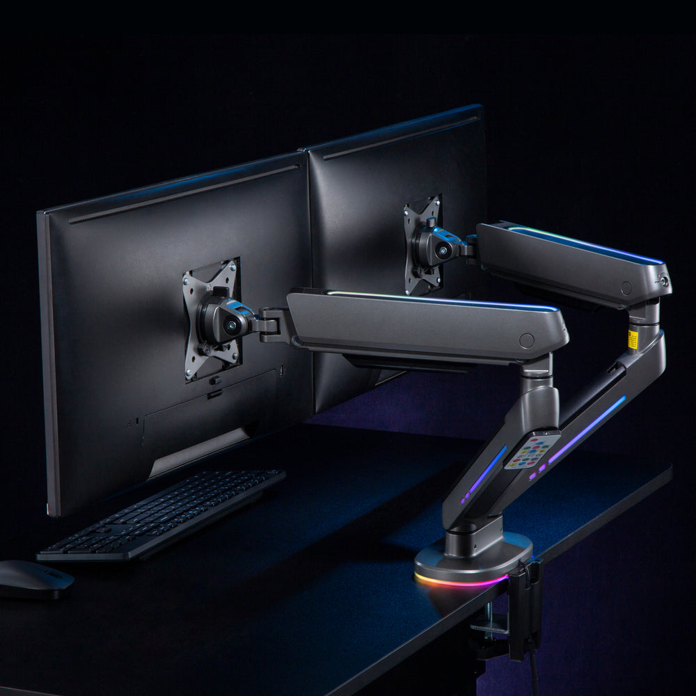 2-Fach Gaming Monitorhalterung 17-32" mit Verstelbare RGB-LED-Beleuchtung Tischhalterung Höhenverstellbar Schwenkbar Neigbar Max. 9kg VESA 75x75 / 100x100
