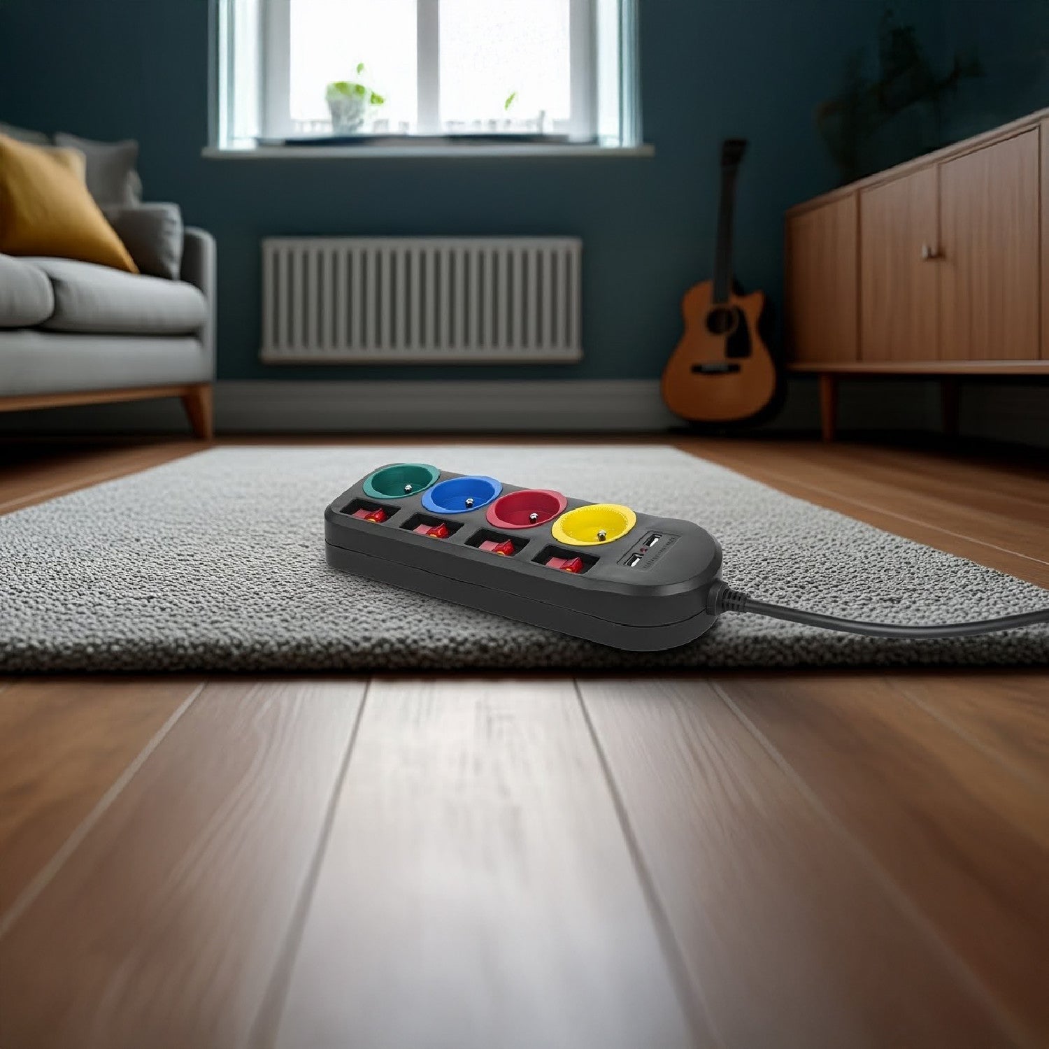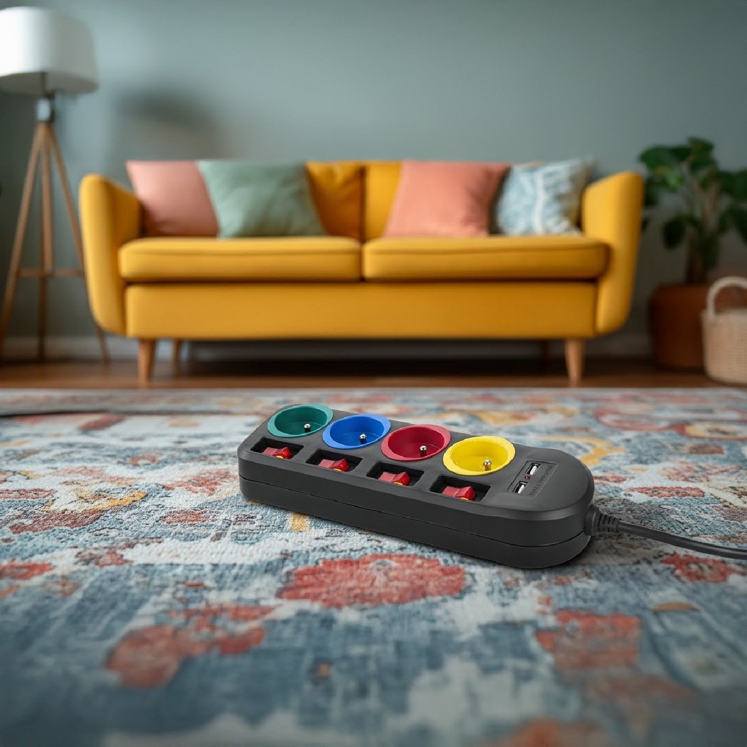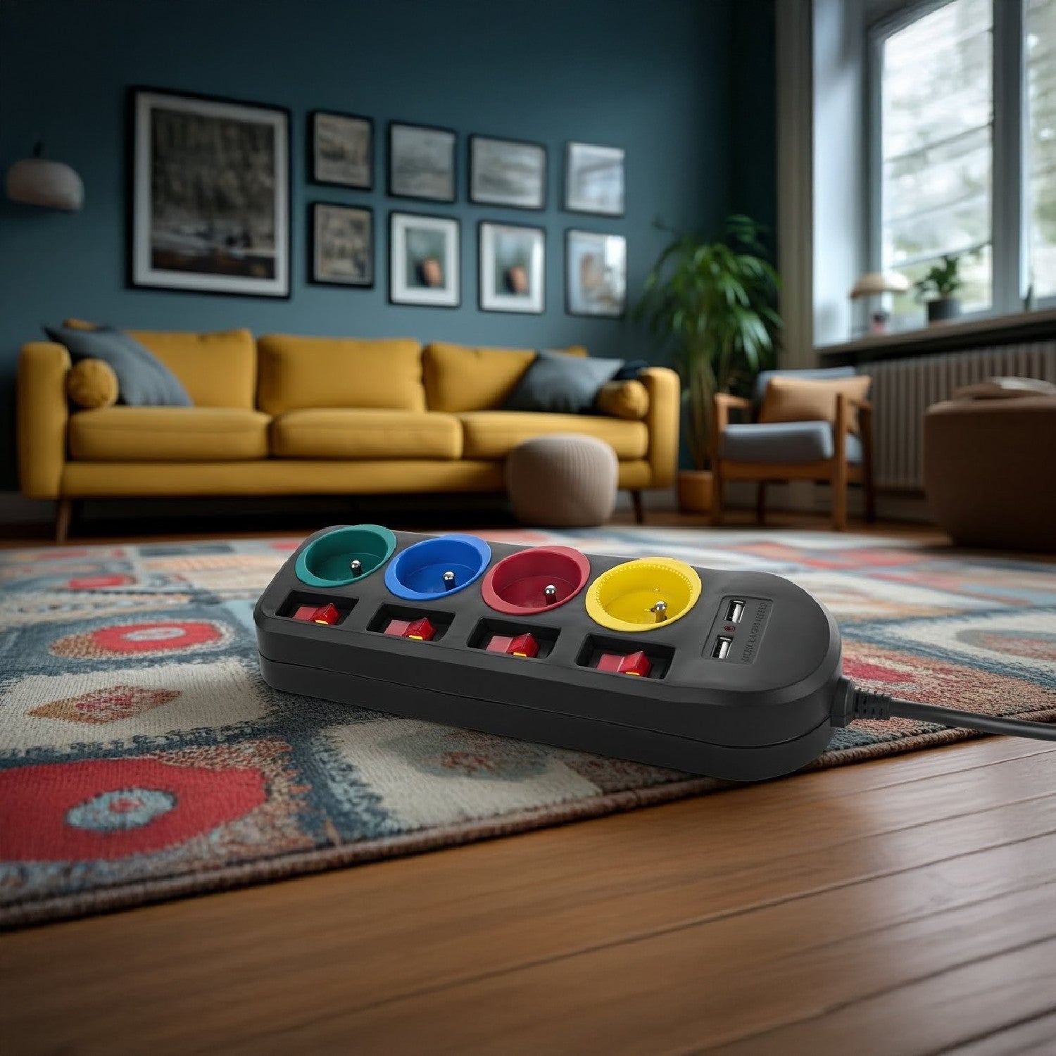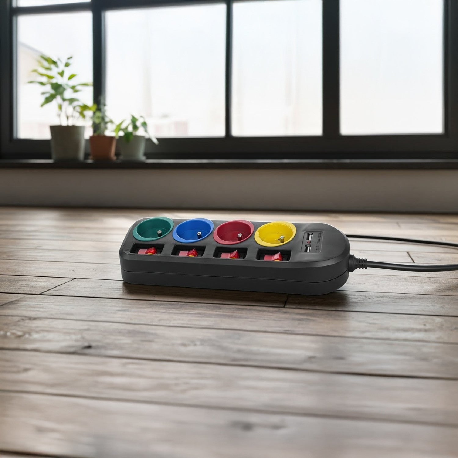 Eine Steckdosenleiste mit 4 Steckdosen ermöglicht den gleichzeitigen Anschluss von bis zu vier vollwertigen Steckern. Sie ist mit einer Kindersicherung, separaten Schaltern für jede Steckdose und 2 USB-Anschlüssen zum Aufladen von Geräten wie Smartphones, Tablets, Digitalkameras usw. ausgestattet.