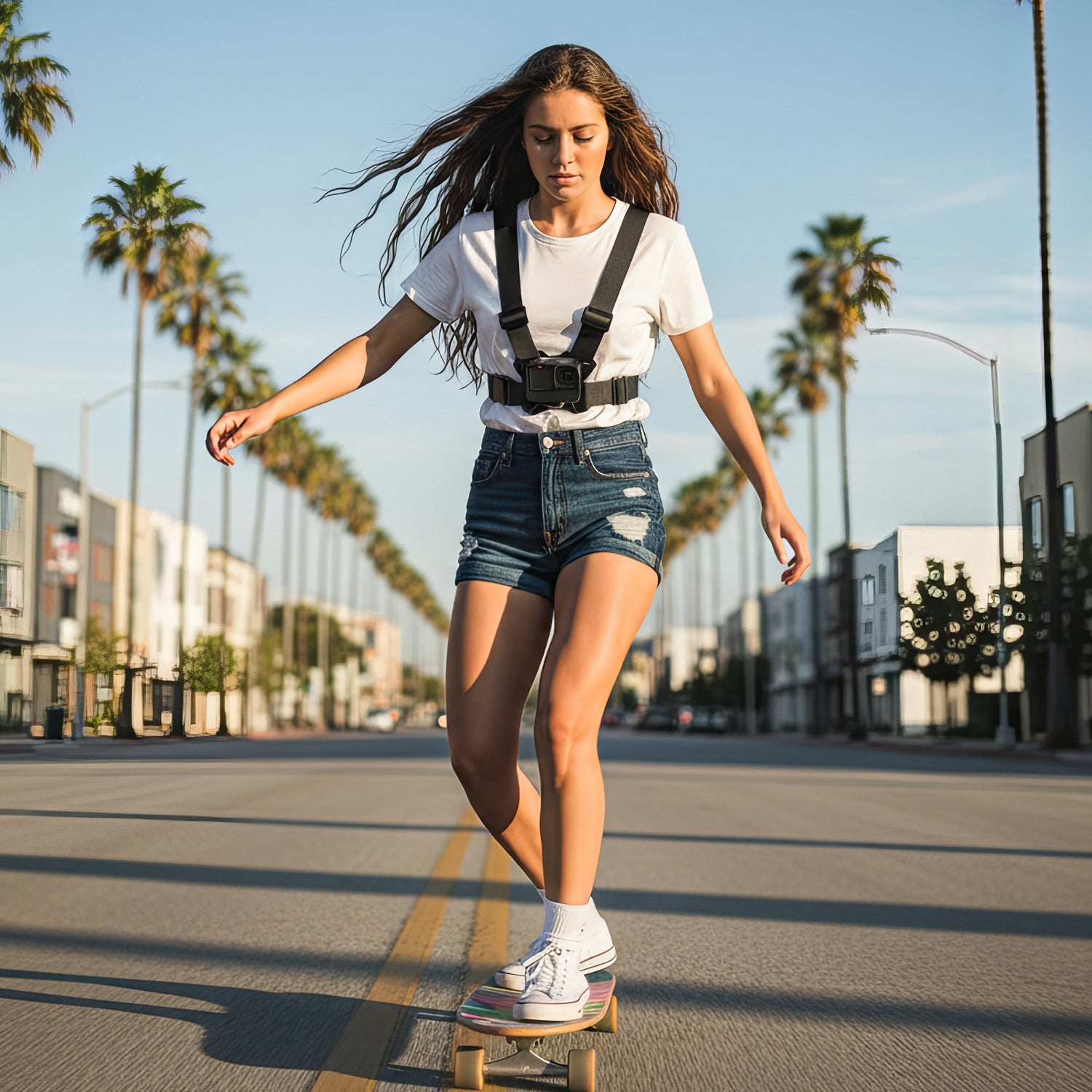 Der eingebaute Spiegel erleichtert die Positionierung im Kamerarahmen, so dass Ihre Inhalte immer von hoher Qualität sind. Die Halterung ist mit Handys mit einer Breite von 52 mm bis 87 mm und einer Höhe von 117 mm bis 150 mm kompatibel, und das eingebaute spezielle Verriegelungssystem sorgt dafür, dass Ihr Smartphone sicher an der Halterung befestigt ist. Die Halterung verfügt über Schnallen zur Längenverstellung, so dass Sie die Länge an Ihre Körperform anpassen können.