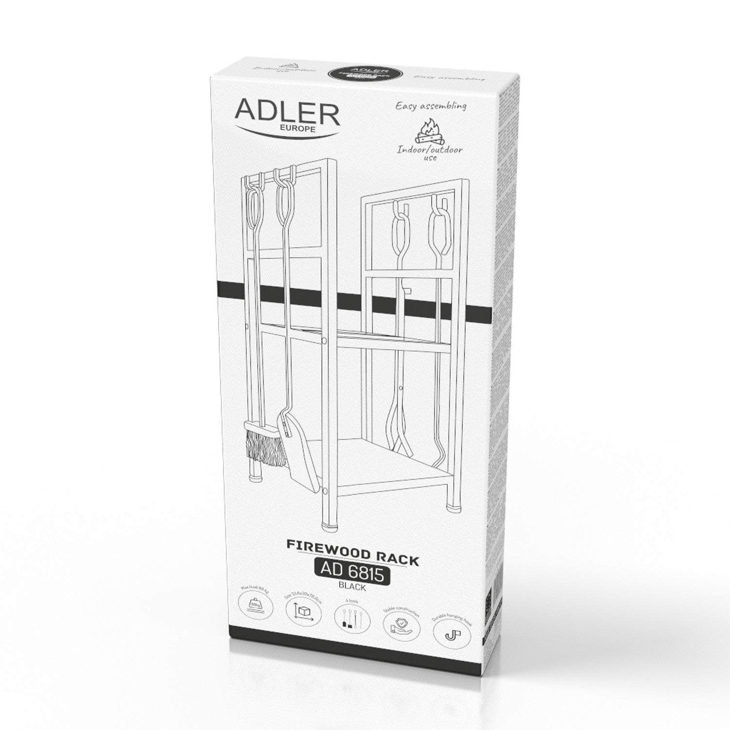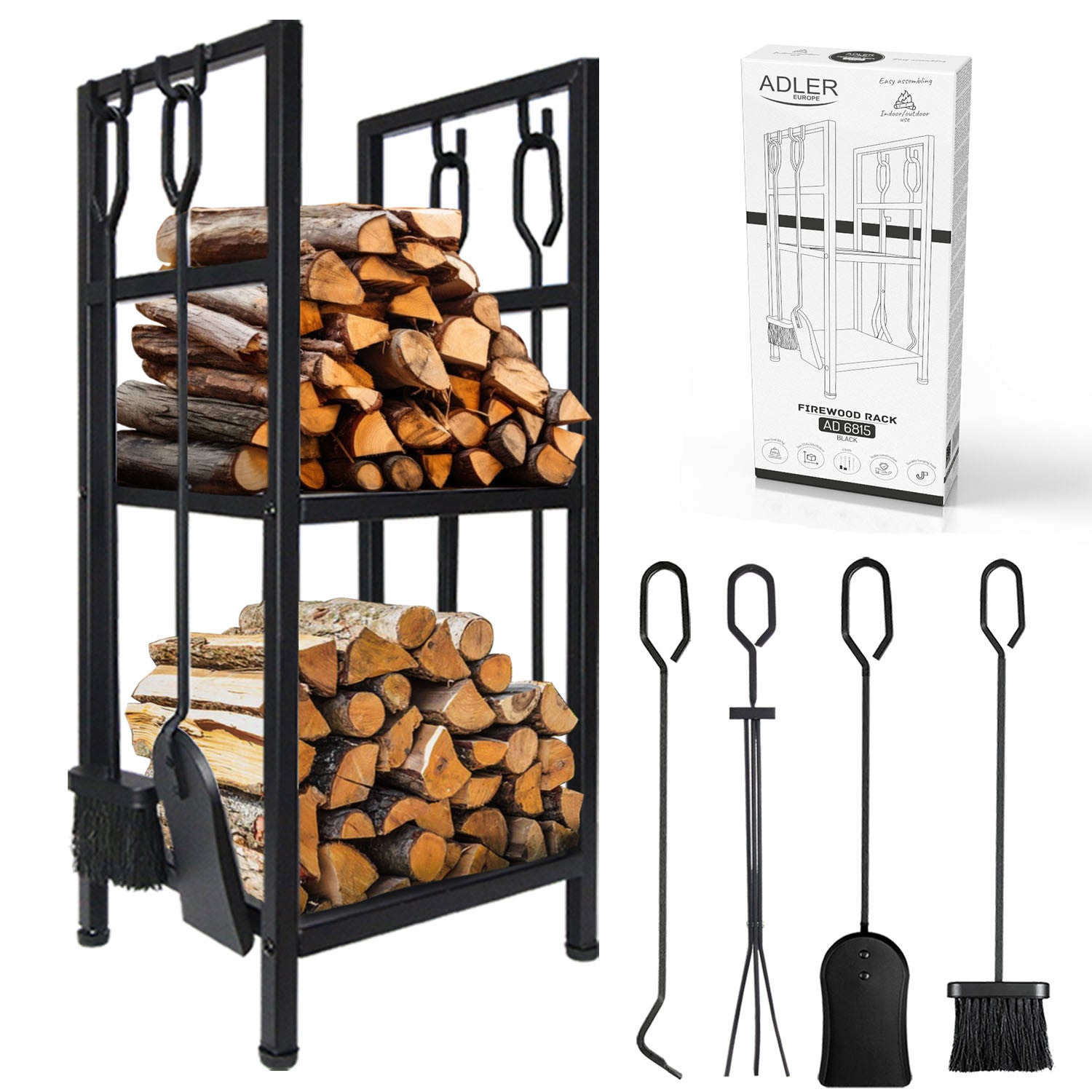 Das AD 6815 ist mit zwei praktischen Ablagen zur bequemen Aufbewahrung von Brennholz, Anzündern und anderem zum Anzünden benötigten Zubehör ausgestattet. Darüber hinaus enthält das Set 4 Kaminwerkzeuge - einen Schürhaken, eine Bürste, einen Spatel und eine Zange - die Ihnen bei der täglichen Nutzung des Kamins helfen und den Bereich um den Kamin sauber halten.