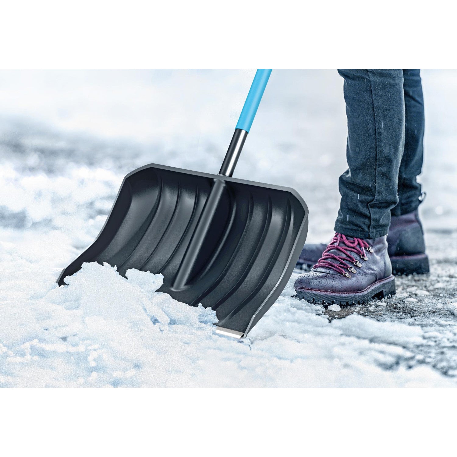Der 150 mm tiefe Kopf ermöglicht es der Schaufel, große Schneemengen zu transportieren, und der mit einem Aluminiumstreifen versehene Rand erhöht die Widerstandsfähigkeit der Schaufel gegen Beschädigungen durch Steine oder harte Schnee- und Eisbrocken.