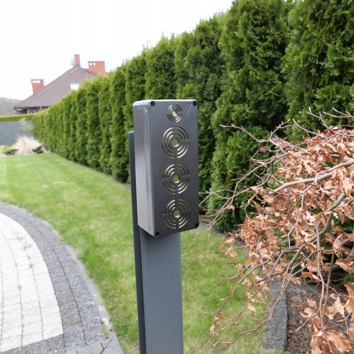 Das Gerät verfügt über vier piezoelektrische Lautsprecher – drei mit einem Durchmesser von 50 mm und einen mit 35 mm – sowie ein Modul zur automatischen Frequenzänderung. Der breite Bereich der ausgestrahlten Signale garantiert eine wirksame Schädlingsbekämpfung, und ihre Modulation verhindert, dass sich die Eindringlinge an den konstanten Ton gewöhnen. Das Ganze wird durch ein hermetisches Gehäuse der Schutzklasse IP65 ergänzt, wodurch der Repeller sowohl in Innenräumen als auch im Freien eingesetzt werden kann. Das Gerät ist beständig gegen Sonneneinstrahlung, Regen, Frost und Wind. Der größte Vorteil des Geräts ist seine Kabellosigkeit und lange Betriebsdauer. Das kabellose Gerät mit einem internen Akku mit hoher Kapazität (4 Ah Li-Ion) kann mit einer einzigen Ladung über 200 Tage lang betrieben werden. Danach muss das Gerät lediglich 24 Stunden lang mit dem im Lieferumfang enthaltenen Ladegerät aufgeladen werden (bis die rote LED erlischt), um es erneut verwenden zu können. Das Gerät vertreibt problemlos Marder, Wiesel, Ratten und Mäuse.