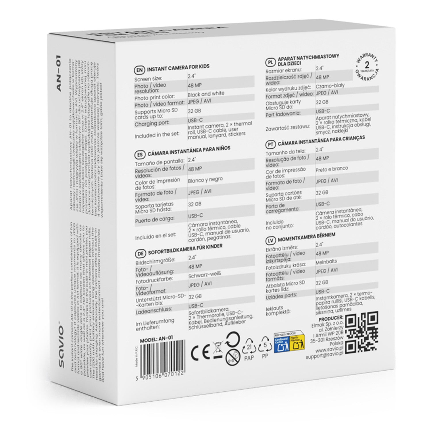 Savio Sofortbildkamera für Kinder, 48MP Auflösung, 2,4'' Bildschirm, 2 Thermorollen, SAVAN-01